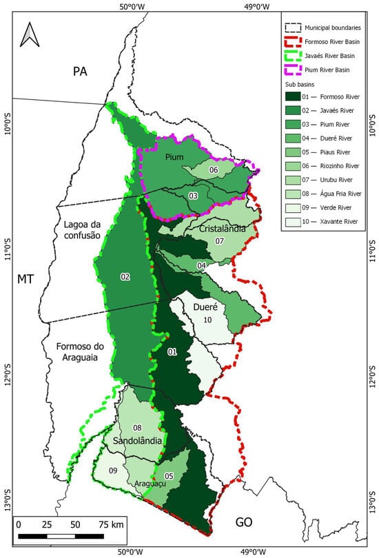 The alluvial plain of the middle Araguaia features a diverse mosaic of Quaternary morpho-sedimentary units with different flood propagation patterns, where the floodplain consists of Holocene and Late Quaternary sediments []. Favorable edaphoclimatic conditions, marked by fertile soils and abundant water availability, create a conducive environment for irrigated agriculture, increasing pressure to convert natural vegetation—particularly the flooded fields (várzeas)—into areas designated for agricultural activity. The municipal limits cover different hydrographic areas comprising sub-basins in the three largest basins (Figure 3).
