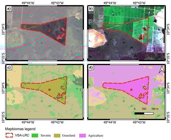 Multitemporal analysis of a hypothetical VSA-LRC area using different images: (a) ALOS image mosaic (2008), (b) Sentinel 2 (2020), (c) MapBiomas land use dataset (2008), and (d) MapBiomas land use dataset (2021).