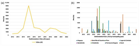 From 2019 to 2022, the VSA-LRC areas had an additional 5487.70 hectares cleared, accounting for 23.95% of the decade’s total deforestation. The years 2019 and 2020 had the most significant deforestation, covering 2186.45 hectares and 1916.63 hectares, respectively, jointly contributing to 81.5% of this period’s total deforestation. Santa Rita do Tocantins and Dueré had the highest VSA-LRC deforestation rates during these years, with 2041.23 hectares and 1484.88 hectares cleared, respectively.