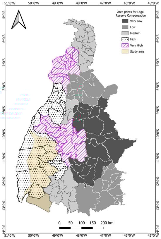 The investigation of the impact of land prices on the selection of areas for VSA-LRCs considered the overlap of the locations of donor and beneficiary properties on the Regional Territorial Map of the State of Tocantins, as detailed in the Land Market Analysis Report of the National Institute of Colonization and Agrarian Reform (Portuguese acronym, INCRA). This comprehensive report tracks land prices over several years, providing a basis for evaluating the impact of land prices during 2012, 2013, and 2014, a period marked by an increase in VSA-LRC claims. INCRA’s analysis categorized land into homogeneous zones based on socioeconomic attributes that affect land price determination. The Tocantins acquired 13 distinct Regional Land Markets (RLMs), accounting for diverse agricultural and forestry activities, including livestock, mixed agriculture, intensive agriculture, and areas designated for Native/Planted Forest. This research reclassified the classes into two: (a) Native Forest/Cerrado and (b) “All RLM Typologies” for the other classes, considering the average price for land within the municipality [] (Table 1). Subsequently, RLM classifications considered five land price categories: (1) Very Low, R$1000.00 to R$1500.00 per hectare; (2) Low, R$1501.00 to R$3100.00; (3) Medium, R$3101.00 to R$4500.00; (4) High, R$4501.00 to R$5000.00; and (5) Very High, above R$5001.00 per hectare. Lower-priced lands showed significant interest for LRCs, while higher-priced areas were less preferred. Analyzing the spatial choices for LRCs against land values helps identify potential economic strategies to maximize gains with minimal land acquisition costs.