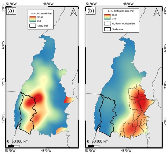(a) Density map of properties with VSA-LRCs issued with irregular use of LR compensation in Tocantins between 2012 and 2014, (b) density map of municipalities with the highest allocation of compensated LRs in the State of Tocantins.