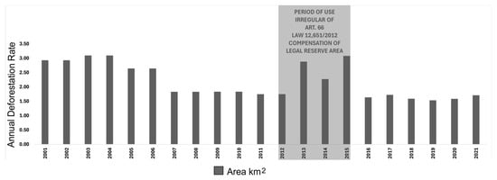Despite the bulk of Brazilian agricultural production occurring on consolidated land, 2% of properties in the Amazon and Cerrado account for 62% of all potentially illegal deforestation, corresponding to approximately 20% of soybean exports and 17% of beef exports to the European Union []. Tocantins ranks second in deforestation in the Cerrado, from 2000 to 2021, with 46.17 km2 or 15.94% of the biome’s total deforested area. Notably, it led deforestation rates in the MATOPIBA region from 2009 to 2019, overtaken by Maranhão after 2020. A significant peak in PRODES deforestation in Tocantins occurred between 2012 and 2015, coinciding with increased VSA-LRC activities. (Figure 8). As demonstrated in the research, the lack of transparency in deforestation authorization data impacts the amount of illegal suppression of native areas that should make up the LRs of properties in areas of agricultural solid pressure, such as the study area.