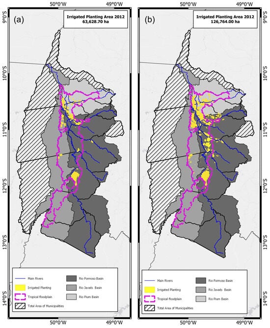 Expansion of the irrigated planting area in the study area using the soil cover from the MapBiomas 8 Collection from the years (a) 2012 and (b) 2022.
