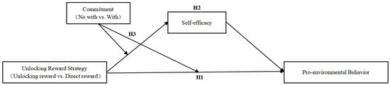 In alignment with the Goal-Setting Theory, setting goals has been shown to stimulate self-efficacy. The unlocking reward strategy, by requiring the completion of a specific unlocking goal, encourages individuals to achieve rewards by reaching these goals [17]. Successfully achieving these unlocking goals can positively enhance an individual’s self-efficacy. As self-efficacy increases, individuals are more likely to believe that their actions can effectively protect the environment, which, in turn, enhances their willingness to engage in pro-environmental behaviors.