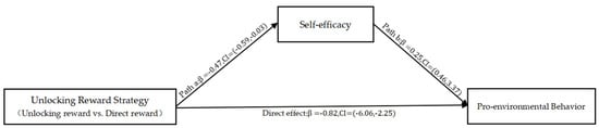 To further investigate the mediating role of self-efficacy, we used the PROCESS for mediation analysis [79], selecting a sample size of 5000 for bootstrapping and employing model 4 to analyze the mediating effect at a 95% confidence interval. The analysis was conducted with the number of participants’ green product purchases as the dependent variable, unlocking reward strategies as the independent variable, and self-efficacy as the mediating variable. The results are shown in Figure 2; the direct effect of unlocking reward strategy on the number of green products purchased was significant (, , , ), and the indirect effect of self-efficacy was significant (, , ), indicating that self-efficacy partially mediated the effect of the unlocking reward strategy on pro-environmental behavior.
