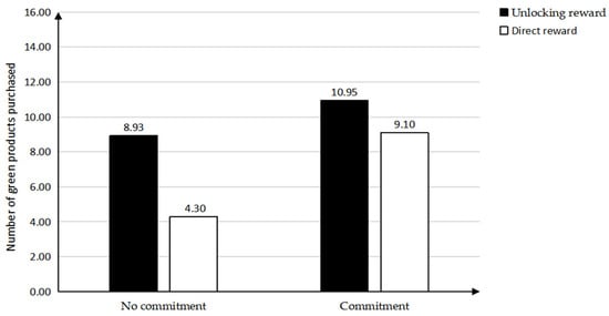 The results of the simple effects analysis are shown in Figure 3; for the no-commitment group, the difference between the number of green products purchased by participants under the unlocking reward (, ) and the number of green product purchases completed by participants under the direct reward was significant (, , ). For the committed group, the number of green products purchased was also significantly higher in the unlocking reward condition (, ) than in the direct reward condition (, , ). These results provide support for H3.