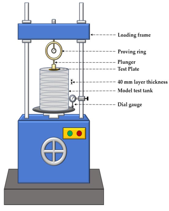 Model analysis was conducted on untreated soil and soil treated with an optimum dosage of nano additives. A circular tank of 270 mm diameter and 320 mm height was used for the study. The authors used the same model tank and followed the same procedure outlined in their previous study about the effect of NS in the same soil [6]. Test soil mixed with water at optimum moisture content was stored in an airtight box for 7 days to facilitate the uniform spreading of moisture [36] and to promote the reaction between soil and the nano additive (if any). Then, the test tank was filled with soil at its maximum dry unit weight in 8 layers, with each layer being 4 cm. Each layer was tamped until the required density was achieved. A circular mild steel plate with a diameter of 50 mm and thickness of 5 mm was used to simulate a rigid circular footing behavior. The diameter of the model footing was chosen such that the test area size was greater than five times the model footing size [37,38]. This was done to ensure that there would be no boundary effect during the model study. Figure 1 illustrates the experimental setup used for the model study. The soil was loaded to failure at a strain rate of 1.25 mm/min and failure was marked by the complete penetration of the plate into the soil.
