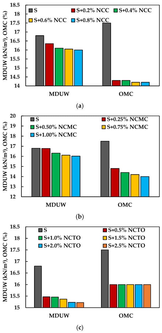 The MDUW and OMC of the untreated soil was 16.8 kN/m3 and 17.5%, respectively. The inclusion of all three nano additives reduced both the MDUW and OMC of the treated soil, as shown in Figure 2. The addition of the highest dosage of nano additives, i.e., 0.8% NCC, 2.5% NCTO, and 1.0% NCMC, resulted in a decrease in the MDUW to 16 kN/m3, 15.22 kN/m3, and 16.02 kN/m3 respectively. The curing of soil specimens before the compaction test promoted a uniform spreading of moisture among the soil–nano additive mixture. The nano additives created a flocculation effect in the soil and increased the voids in the soil matrix [42]. Additionally, authors like Tisdall and Oades [43] and Mustafa et al. [44] stated that the presence of organic content in the soil would promote the aggregation effect. This consequently reduced the MDUW of the treated soil as a result of resistance to further rearrangement and denser packing.