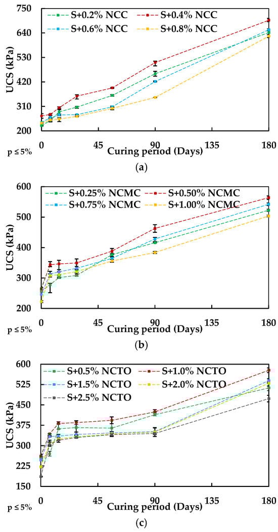 Soil treated with 0.4% NCC exhibited a maximum UCS of 266.73 kPa and 697.09 kPa with 2 h and 180-day testing, respectively. Similarly, the bio-nano additives also showed an increase in strength up to 180 days. Soil treated with 1.0% NCTO and 0.5% NCMC showed a maximum strength of 577.56 kPa and 563.83 kPa, after 180 days. In all cases, treated soil showed maximum strength at an optimum dosage of 0.4% NCC, 1.0% NCTO, and 0.5% NCMC. In 180 days, the strength increased by 3.04, 2.25, and 2.27 times at the optimum dosages, respectively.