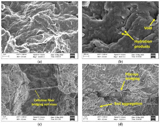 The physical interaction between the soil and nano additives was investigated using FESEM micrographs. The FESEM images of untreated and nano-additive-treated soil taken after 28 days of curing are shown in Figure 4.