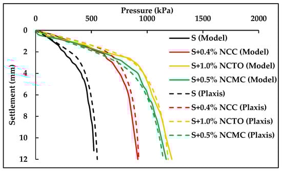 The model study was conducted on untreated soil and soil treated with different nano additives at their optimum dosages as per the test specification mentioned in Section 3.4. The load settlement curves obtained from the model study are shown in Figure 5 with continuous lines. The untreated soil failed without a definite failure load, indicating local shear failure under the foundation load. Soil treated with bio-nano additives also showed a similar response. This is in line with the plastic behavior observed with stress–strain response during the strength test [30]. Although nano calcium carbonate started showing brittle behavior with aging, the delayed CSH formation caused the sample to fail in local shearing during the model study [7,8].