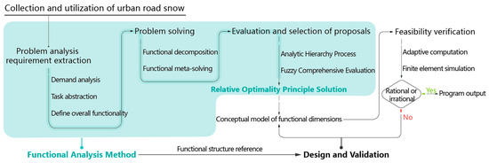 This study employs functional analysis to analyze and select the optimal functional structure reference for the collection and utilization of snow resources, thereby devising a feasible conceptual scheme. Research on the design of snow collection and compression equipment has focused on urban road snow collection and utilization as the starting point of the design process. First, demand analysis and extraction are conducted via functional analysis, and the system boundaries are defined through task abstraction, followed by the definition of the overall system function, functional decomposition, and functional element resolution. Multiple principle solutions are obtained through a morphological matrix. The AHP (Analytic Hierarchy Process) and fuzzy comprehensive evaluation methods are used to screen and assess the schemes, leading to the decision of the relatively optimal principle solution for the problem. Subsequently, innovative design is carried out on the basis of the optimal functional structure derived from functional analysis, and a functional dimension conceptual model is established. Following this, product structural parameter design is performed, reasonable parameter combinations are determined through the adaptability calculation of collection and compression efficiency, and the feasibility of the scheme is verified through finite element simulation. Ultimately, a reasonable and feasible product conceptual scheme is output. The design process is illustrated in Figure 1.