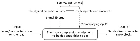 On the basis of demand analysis, the design task is abstractly described as follows: design snow collection and compression equipment that can efficiently and stably clear, collect, and transform accumulated snow on urban roads into standardized compressed snow blocks with high plasticity to meet the requirements for creating an ice and snow city IP that emphasizes the diversification of ice and snow landscapes, the scaling of quantity, and the regularization of layout. In summary, the overall functional definition of the research object is a snow collection and compression vehicle that can efficiently and stably collect and compress accumulated snow on roads into standardized snow blocks and output them. Its black box model is shown in Figure 2.