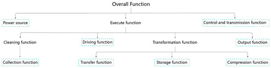 The overall functional definition of snow collection and compression equipment is relatively abstract, and the corresponding functional system is complex and unknown, making it difficult to intuitively propose design solutions that meet the requirements. Therefore, it is necessary to decompose the complex functional system into a hierarchical functional structure tree diagram on the basis of functional types and the important hierarchy of functions until directly solvable subfunctions and functional elements are reached (Figure 3).
