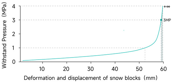 First, the task volume for a single snow compression operation is determined. Given that the standardized snow blocks produced by snow collection and compression equipment are primarily used for the construction of snow sculpture landscapes, the dimensions of the output snow blocks should meet the requirements for large snow sculptures. However, traditional manual snow sculpture construction employs nonstandard wooden frames and does not specify clear dimensions for the snow blocks. Therefore, the dimensions of the output snow blocks are set to 1 × 1 × 1 m3, referencing the 3 × 3 × 3 m3 standard required for snow sculpture competitions. Additionally, owing to the varying densities of snow under different conditions, this calculation selects a commonly used density of 0.3 g/cm³ for clean compressed snow as the processing medium. According to compression tests, when the pressure reaches 3 MPa, the displacement approaches 0, reaching the maximum compression limit of the snow, with a compression ratio of 3:1 [45], as shown in Figure 4.