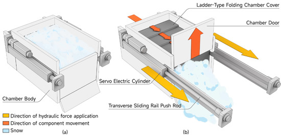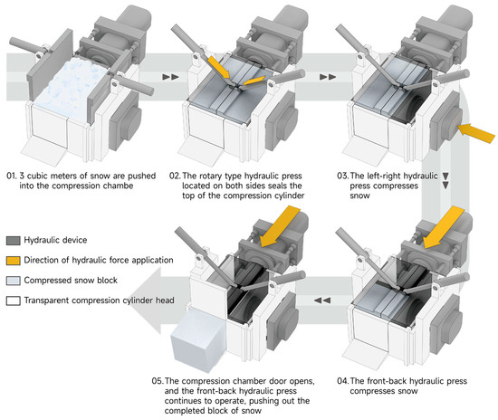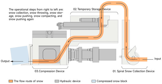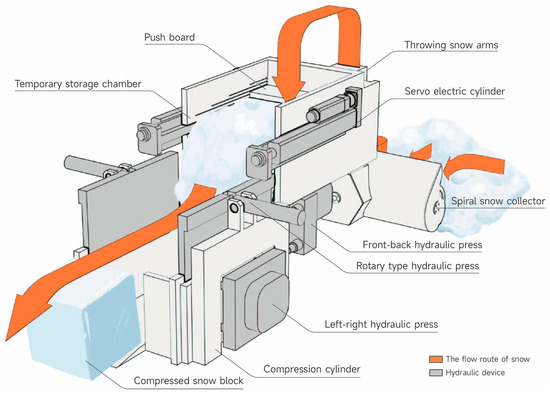 In the field of snow resource management equipment, research emphasis has been placed on disaster prevention and mitigation [25]. These devices are primarily designed for the efficient clearing and transportation of snow while neglecting the potential for the recycling and utilization of snow resources. Research on snow removal equipment generally focuses on exploring more efficient and economical snow removal methods [26]. According to different usage environments, they can be categorized into wheeled and tracked, heavy-duty, and medium–small types. Based on the snow removal methods, they can be classified as snow pushing [27], snow sweeping, snow melting [28], snow blowing, and snow throwing [26]. In the application of snow transportation equipment, dump trucks and snow trailers are typically used to transport and pile snow in designated areas away from urban centers. While this approach can swiftly resume societal productivity and ensure the unimpeded flow of traffic, the large-scale relocation of snow has the potential to disrupt the hydrological balance in an area [29], leading to detrimental effects on the local ecosystem. Therefore, the sustainable clearing of snow has become a current research focus, such as the application of snow melting technology [30] for the onsite collection of snow. In addition, to facilitate the transportation of accumulated snow and achieve standardized stacking, researchers have proposed a method for compressing snow into blocks [31,32], which provides a theoretical basis for the subsequent recycling and utilization of natural snow.
