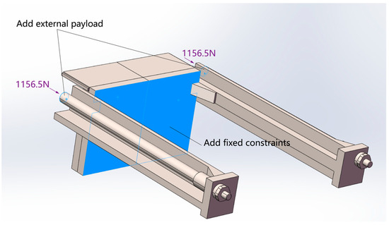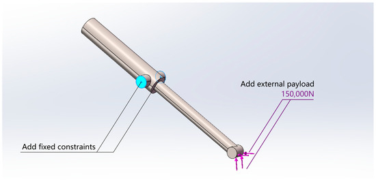 - Loads and constraints are applied. A force of 1.5 × N is applied in both the vertical direction (along the z-axis) and the horizontal direction (along the x-axis) on the hydraulic press head, and a fixed constraint is added at the rotation axis of the hydraulic press (Figure 17);