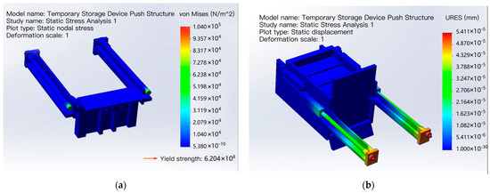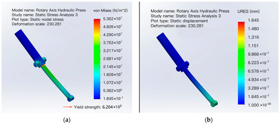 Figure 18. Stress and displacement cloud diagrams of a rotary axis hydraulic press in SolidWorks. (a) Stress diagram of the hydraulic press; (b) deformation displacement diagram of the hydraulic press.