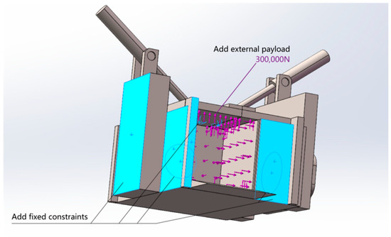 Figure 17. Load and constraint addition of rotary axis hydraulic press. - Grid partitioning. High-quality grid elements are used for grid partitioning, with a default grid accuracy level set to moderate. The grid parameters are based on mixed curvature, with Jacobian points at 16. The total number of grid nodes is 15,756, the total number of elements is 9163, and the maximum aspect ratio is 5.7;