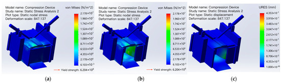 - Conduct simulation calculations. Through simulation analysis, the stress–strain contour map of the rotary axis hydraulic press was obtained (Figure 18).