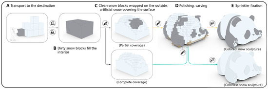 For ice and snow tourism, a new strategy for the sustainable utilization of snow resources with strong adaptability is proposed in this study [52]. A special phenomenon has been revealed through research: outside of snow and ice tourism areas, a significant amount of accumulated snow on roads is regarded as a safety hazard and is cleared and discarded; in contrast, within snow and ice tourism areas, due to insufficient natural snowfall, people are compelled to rely on artificial snowmaking, which negatively impacts the ecological environment, to meet the demand for snow. The reasons for this phenomenon can be succinctly summarized in two aspects: the purity of the snow and the costs associated with collection and transportation. In response, this study proposes a sustainable utilization strategy that involves the recovery and reuse of natural snow through snow collection and compression equipment and its application in the construction of urban snow sculpture landscapes. The core of this strategy revolves around onsite utilization, entailing the direct construction of small snow sculptures from the collected and compressed standardized snow blocks at the original site or in broad areas within the city (such as parks and squares). This approach not only economizes on the costs related to the long-distance transportation of snow to traditional scenic areas but also avoids the disruption of regional water resource regulation caused by the large-scale transfer of snow resources, thereby minimizing the environmental impact of resource utilization. Secondly, regarding the purity of the collected snow, this strategy does not require the purification and refinement of the collected snow but rather achieves this goal by altering the utilization methods of the recycled snow. On the one hand, snow blocks of lower purity can be employed as internal support structures within snow sculptures, overlaid with a thin layer of artificially produced snow, and refined through a process of spraying and freezing; on the other hand, dirty snow blocks can serve as dark accents for snow sculpture, further enriching the visual experience of sculpture. The two utilization methods of dirty snow and the process of building snow sculptures are illustrated in Figure 19.