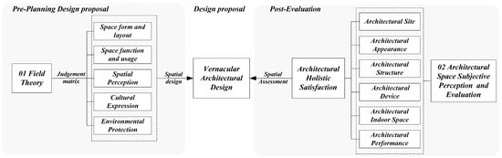 This study aims to develop a research framework for assessing spatial perception in vernacular architecture grounded in field theory and a spatial perception evaluation matrix (Figure 2). The framework comprises two main components. The first component distills the spatial guiding factors from field theory, encompassing five dimensions, namely spatial morphology and layout, functional use, sensory perception and experience, cultural expression, and environmental protection. These elements collectively shape how inhabitants engage with their built environment, emphasizing the relationship between spatial design and sustainability. The second component focuses on the assessment of architectural spatial perception, which includes six dimensions, which are site location, exterior appearance, structural integrity, facilities, internal space, and performance. This dual-layered framework enables a comprehensive evaluation of vernacular architecture, ensuring that both spatial characteristics and functional attributes are considered.