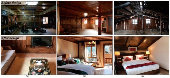 The interior design (Figure 7) aligns with the vernacular ethos but introduces modern amenities. The lower two floors house symmetrical guest rooms, while the third-floor attic has been transformed into suites complete with living and sleeping areas. Centralized staircases and bathrooms ensure efficient circulation and drainage while maximizing sunlight exposure for south-facing rooms. Public functions are concentrated on the ground floor, enhancing the space’s flexibility as a communal area or hotel lobby. The use of warm wooden furnishings and vibrant interior accents recreates the familiar ambiance of a traditional Tibetan household, offering comfort and cultural immersion. Among them, a, b, and c represent different angles of the venue.