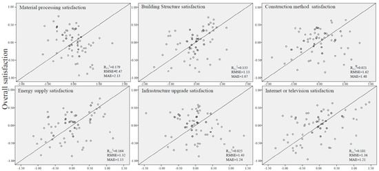 In terms of structural design, satisfaction with the building structure had a notable positive effect, with coefficients ranging from 3.05 to 6.37, illustrating the crucial role that structural integrity and attention to construction details play in shaping user perceptions. However, satisfaction with material processing showed a significant negative impact, with coefficients as low as −3.134, suggesting that poor material treatment undermines otherwise positive structural features.
