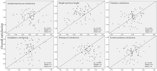 where represents the spatial quality index, represents the intercept, represents the independent variables, and represent the regression coefficients. ε represents the error term, accounting for the random variation that the model cannot fully explain. The R-squared value measures the proportion of variance in the dependent variable that is explained by the independent variable. It ranges from 0 to 1, where 1 indicates a perfect fit. The formula for calculating the R2 value, RMSE, and MAE is