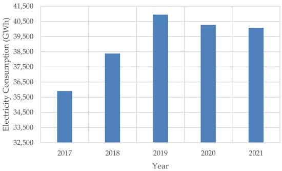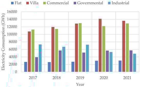 Figure 1 shows the total annual electricity consumption in Qatar across all the sectors between 2017 and 2021. The peak was seen in 2019 (40,942 GWh), with the lowest in 2017 (35,906 GWh).