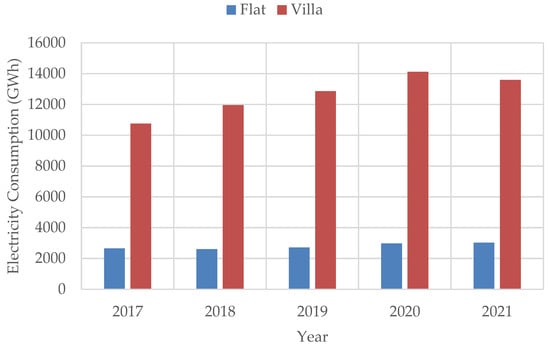 Figure 3 shows the electricity consumption (GWh) in Qatar’s residential sector—a large part of the electricity consumption is in villas (the highest in 2021 (13,592 GWh))—depicting the dominance of this building form in the residential sector.