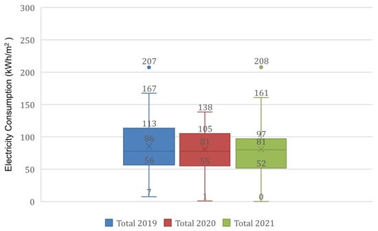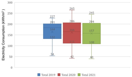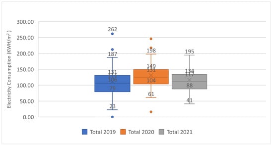 Figure 7 shows a notable increase in the annual electricity consumption from 2019 to 2020, with an 18.53% rise observed during this period for C4. However, there was a subsequent decrease in the electricity consumption from 2020 to 2021, with an 11.10% decline recorded. Furthermore, the mean annual electricity consumption is reported to be (119 ± 49) kWh/m2.