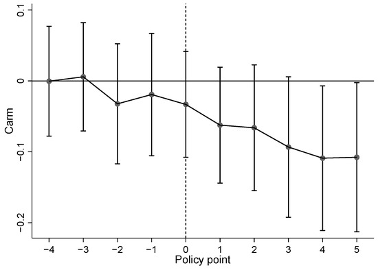 Drawing upon the research conducted by Beck et al. (2010) [35], we examine the parallel trend and dynamic effects within a sample interval spanning five years before and after the implementation of the DPP. We designate −5 years as the benchmark period to mitigate the potential influence of multicollinearity. The specific model employed for this analysis is presented in Equation (2).