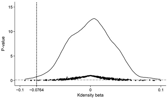 Following the methodology adopted by Meng and Li (2023) [36], we randomly sampled 22 cities from a pool of 280 to serve as “pseudo-treatment groups” and subsequently re-estimated the year of policy implementation. We constructed a randomized experiment using this framework across two dimensions, namely policy implementation time and city. We replicated this iterative process 500 times, and the resultant kernel density and p-value distribution maps of the estimated coefficients were plotted, as presented in Figure 2. Meticulous observation shows that the pseudo-regression coefficient values approximately adhere to a normal distribution centered at zero. Specifically, the estimated value of the actual coefficient, −0.0764, which corresponds to the intersection of the vertical dashed line with the horizontal axis in the graph, resides within the left tail of the pseudo-regression coefficient distribution. This observation suggests that the estimated value of the actual coefficient represents a low-probability event, indicating that unobservable factors do not confound the CER effect attributed to the DPP. This finding further reinforces the robustness of our benchmark regression results.