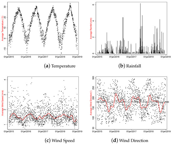 https://data.kma.go.kr (accessed on 17 February 2021)). They encompass temperature, precipitation, and wind pattern (wind speed, wind direction) collected from the 510 Automatic Weather Stations (AWSs) in the country.