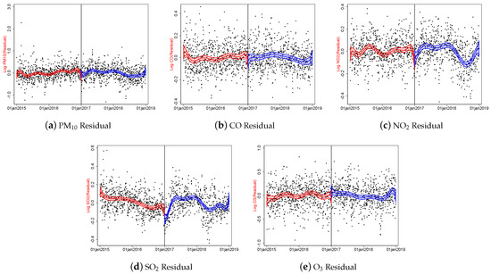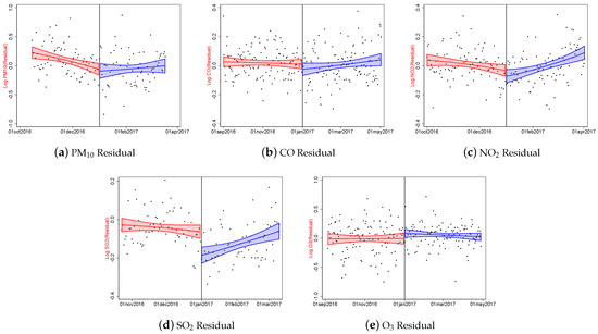 Figure 5 displays an eighth-degree global polynomial trend for each pollutant, marked by a vertical line at the policy’s initiation date. Hausman and Rapson [