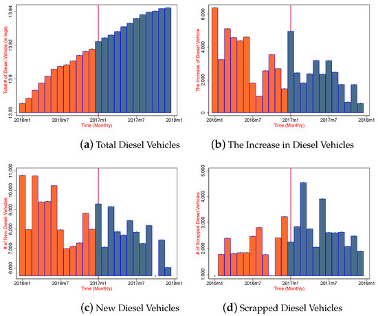 Figure 7, panels (a) through (c) depict the total number of diesel vehicles, new diesel vehicles, and scrapped diesel vehicles for one year before and after the policy’s implementation, respectively. The total number of diesel vehicles continues to rise over time, with the increase being significantly greater than the month just before the policy (as shown in panels (a) and (b) of