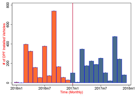 Figure 8 displays the number of diesel vehicles equipped with DPF. While it may be expected that more owners of older diesel vehicles would install DPF, the graph does not show any significant changes following the policy.