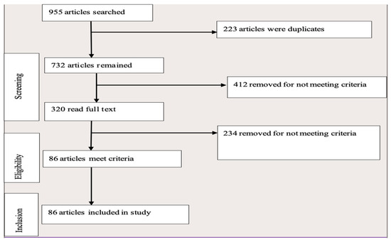 The studies included from the literature were gathered and analyzed using thematic analysis. This method was chosen because the research was secondary, reviewing the findings of existing studies. The aim was to analyze the trends, effects, and deterrents of collective market participation among smallholder farmers in various countries, ultimately drawing conclusions relevant to sub-Saharan Africa. A total of 955 articles were initially downloaded for selection, of which 223 were duplicates. After removing the duplicates, 732 articles remained. Of these, 412 did not meet the study criteria and were discarded, leaving a pool of 320 articles. Following a thorough thematic review, an additional 234 articles were found not to meet the study criteria and were also removed. This left a total of 86 articles, all of which were included in the study. Figure 2 presents a visual analysis.