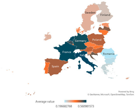 Notably, the average values for Italy, the Netherlands, France, Belgium, and Germany exhibit minimal variation. For instance, Italy’s average value over the period 2010–2020 is 0.5749, representing the highest among the five countries, while Germany’s is 0.5141, the lowest among the five countries (Figure 2).