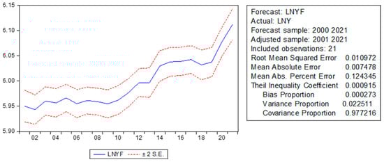 3. In Figure 1: The estimated model has good predictive ability according to the indicators used to measure model efficiency, as the square root of the mean square of random error reaches 0.01, the average absolute error is 0.007, the average percentage of absolute error is 0.124%, and the Theil inequality coefficient (U-Theil) is 0.001. The closer the value of the Theil inequality coefficient is to zero, the more efficient the estimated model becomes;