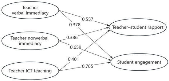 As the preliminary analysis of the sample conformed to a normal distribution, Pearson correlation was used (Table 4). Using the Pearson product–moment correlation coefficient, we explored the correlation among teacher verbal immediacy, teacher nonverbal immediacy, teacher ICT teaching, teacher–student rapport, and student engagement. The results revealed a significant positive between the following: teacher ICT teaching and teacher–student rapport (r = 0.577, p < 0.001), teacher verbal immediacy and student engagement (r = 0.702, p < 0.001), teacher nonverbal immediacy and student engagement (r = 0.838, p < 0.001), teacher ICT teaching and student engagement (r = 0.543, p < 0.001), and teacher ICT teaching and teacher verbal immediacy (r = 0.415, p < 0.001). Therefore, H3 is validated. In addition, a significant positive correlation was noted between teacher verbal immediacy and teacher–student rapport (r = 0.827, p < 0.001) and between teacher nonverbal immediacy and teacher–student rapport (r = 0.785, p < 0.001), but there was a significant negative correlation between teacher nonverbal immediacy and teacher ICT teaching (r = −0.386, p < 0.001). Therefore, H4 is validated. Furthermore, a significant positive correlation was observed between student engagement and teacher–student rapport (r = 0.493, p < 0.001).