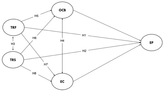 Conversely, distinct from TRF, studies have shown that OCB mediates the relationship between TRS and EP. For instance, ref. [94] supported this assertion and stated that employees who show high levels of OCB are more likely to respond positively to transactional leadership. This is because transactional leaders clearly define expectations and provide feedback, which can motivate employees to go beyond their basic job requirements and engage in OCB. Additionally, [95], stated that the effectiveness of transactional leadership in improving EP might depend on the extent to which employees are willing to exhibit extra-role behaviours, and [96], asserted that both leadership styles have a bearing on OCB, with the TRF approach being more profound. Therefore, the following hypotheses are proposed:
