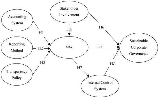 SMA has a positive impact on SCG through a variety of means. Sustainable accounting practices enhance transparency by offering precise and reliable information regarding a company’s ESG productivity [28,50]. This enables stakeholders to hold companies responsible for their ESG impacts, fostering good corporate governance. Sustainable accounting aids in the identification and management of ESG risks, such as climate change regulations and ethical sourcing concerns [31,33]. By proactively addressing these risks, companies can ensure long-term sustainability and value creation, aligning with the principles of good governance. A more comprehensive perspective on a firm’s growth, considering the needs of all stakeholders rather than just shareholders, is encouraged through sustainable accounting [32,51]. Integrated reporting, which presents financial and non-financial information (ESG metrics) together, is often a result of sustainable accounting practices [5,36]. Sustainable accounting facilitates establishing and monitoring progress regarding sustainability goals [5,36]. This data-driven approach enables the board to evaluate management’s performance in achieving these goals, which is vital for effective corporate governance [55]. By providing the necessary information and framework, SMA empowers companies to make sustainable decisions, effectively manage risks, and be accountable to a broader range of stakeholders [32,56]. These efforts collectively contribute to establishing a more sustainable and responsible accounting and governance system, which is the foundation of good SCG [7,30]. In line with the above argument, the hypothesis below was developed.