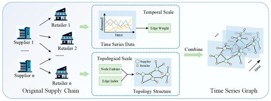 Different entities within the supply chain are abstracted into nodes in the graph, and representations of edges are derived based on the connections between nodes. Subsequently, a node feature vector is constructed, encapsulating the information inherent to each node, with representing the dimensionality of node features. This establishes the topological structure of an individual graph. Next, the original supply chain data are decomposed into demand data between distinct nodes at the time scale, constituting the weights of edges within the graph. Finally, the topological information of the graph and the weight information of the edges are amalgamated to obtain a time series graph sequence containing time steps, where . The construction process of the time series graph is elucidated in Figure 2.