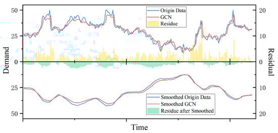 The prediction results reveal that the original GCN model effectively aligns with the overall trend of demand data at the daily scale. Although there is a certain degree of lag in predicting demand changes at abrupt points, the results demonstrate the ability to track short-term fluctuations in demand. Upon adopting a 7-day average demand, the disparity between demand predictions and actual values notably diminishes, and the prediction residuals show a substantial reduction. This signifies a significant enhancement in the model’s predictive performance at the weekly time scale. In conclusion, the GCN model adeptly anticipates demand changes at the daily scale and accurately tracks demand at the weekly scale, achieving more precise forecasting.