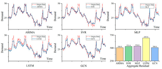 Figure 4 presents a comparative analysis of various algorithms forecasting the demand between the same nodes discussed before, alongside a compilation of the aggregate residuals associated with each method. The comparative experiments computed indicators at both daily and weekly scales. The results are presented in Table 5, with optimal values highlighted in bold.