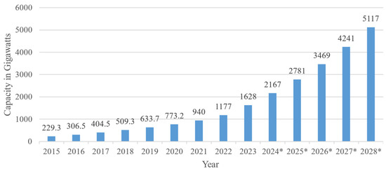 - Statista. Cumulative Installations of Solar PV Capacity Worldwide from 2015 to 2023, with a Forecast Until 2028. 2024. Available online: https://www.statista.com/statistics/1024067/forecast-for-total-installations-of-solar-energy-capacity/ (accessed on 27 September 2024).