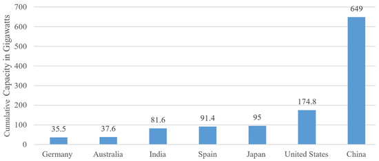 PV solar energy is considered one of the main players in helping countries achieve their environmental goals. PV technology has experienced a remarkable surge in recent years, driven by factors such as increasing energy demand, climate change concerns, and technological advancements [7,8]. The global installed PV capacity has witnessed exponential growth, as shown in Figure 1 [9]. Significant contributions in terms of global installed PV projects come from countries such as China, the United States, and Japan, as shown in Figure 2 [10]. The decline in PV system costs, supportive government policies, and growing environmental awareness has been a major driver of this expansion.