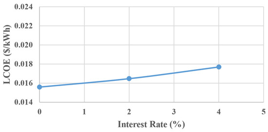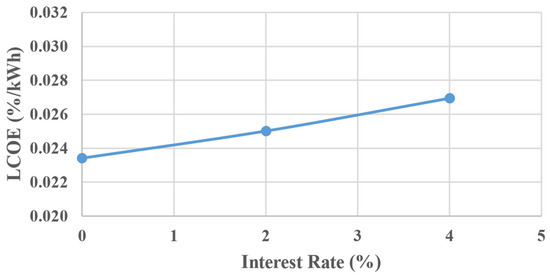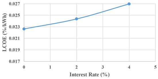 The effect of different interest rates (0%, 2%, and 4%) on the LCOE, assuming a fixed initial system efficiency of 0.95 and a degradation rate of 0.5%.